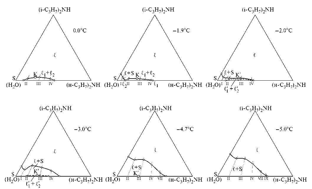 Ниже 0°C в системе начинается кристаллизация льда. При понижении температуры поле кристаллизации льда ℓ+S (S – лед) увеличивается в размерах, и на фазовой диаграмме при –1.9°C оно контактирует в точке ℓ₂ с полем расслоения ℓ₁+ℓ₂на стороне треугольника состава, отвечающей двойной системе вода – дипропиламин (рис. 4). При этой температуре в двойной системе вода–дипропиламин осуществляется монотектическое равновесие, обозначенное на диаграмме отрезком Sℓ₂ℓ₁ (рис. 4). С дальнейшим понижением температуры поле кристаллизации льда ℓ+S закрывает поле расслоения, которое становится метастабильным. Метастабильное поле расслоения ℓ₁’+ℓ₂’ обозначено плавной пунктирной линией с критической точкой К’ на изотермах при –2.0° и –3.0°C (рис. 4). Понижение температуры ведет к уменьшению его площади и при –4.7°C (изотерма на рис. 4) оно сжимается в критическую точку К’, отвечающую составу метастабильной нижней критической точки двойной системы вода–дипропиламин. На фазовой диаграмме при –5.0°C (рис. 4) остается только поле кристаллизации льда ℓ+S.