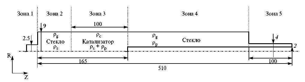 Представленная лабораторная установка допускает варьирование толщины слоя катализатора. В рамках данной работы рассмотрим процессы, проходящие при толщине катализатора 0.1 м. В качестве материала катализатора используется алюмофосфат. Для удобства дальнейшего анализа обозначим цифрами 1, 2, 3, 4, 5 – свободную левую зону реактора, зону левого уплотнителя, зону катализатора, зону правого уплотнителя и правую свободную зону.