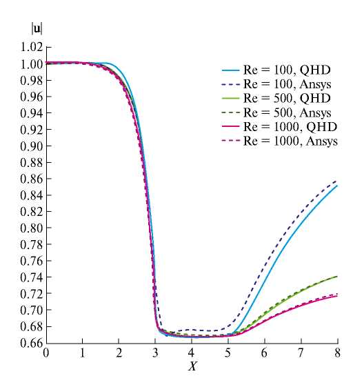 Рис. 3. Распределения модуля скорости вдоль центральной линии (штриховые линии – расчеты в Ansys Fluent, сплошные – оригинальная модель, синий – Re = 100, зеленый – Re = 500, пурпурный – Re = 1000).