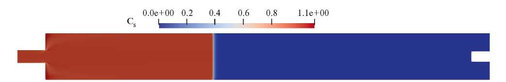 Посредством полученного распределения скорости был проведен расчет эволюции концентраций веществ. Начальные распределения сырья и продукта реакции во всей области расчета принимались равными значениям 0.95 и 0.05. На левой границе безразмерная концентрации сырья задавалась значением 1. Модельные коэффициенты диффузии задавались равными Ds = Dp = 0.1.