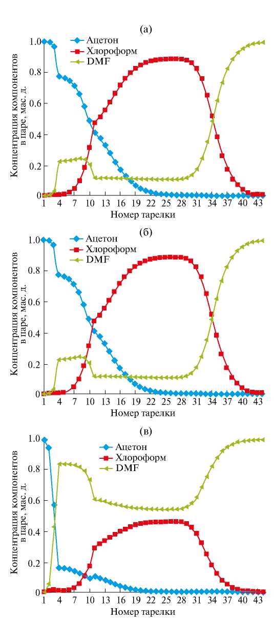 Рис. 5. Распределение концентраций компонентов по высоте основной колонны схемы PTCED (а) и экстрактивной колонны с боковым отбором схем DC-SSED-V (б) и DC-SSED-L (в) при разделении смеси ацетон-хлороформ.