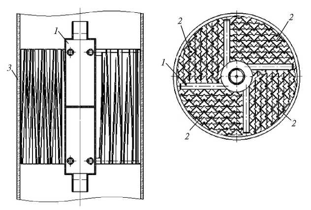 Рис. 1. Конструкция контактного тепло- и массообменного устройства: 1 – теплообменный блок, 2 – слой насадки, 3 – корпус аппарата.