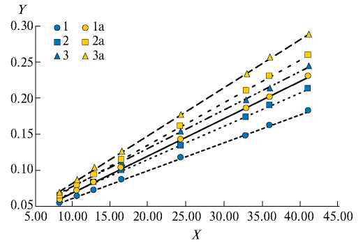 Рис. 7. Зависимость Y от X для разных модификаций контактного устройства 1, 2, 3, 1а, 2а, 3а (табл. 1).