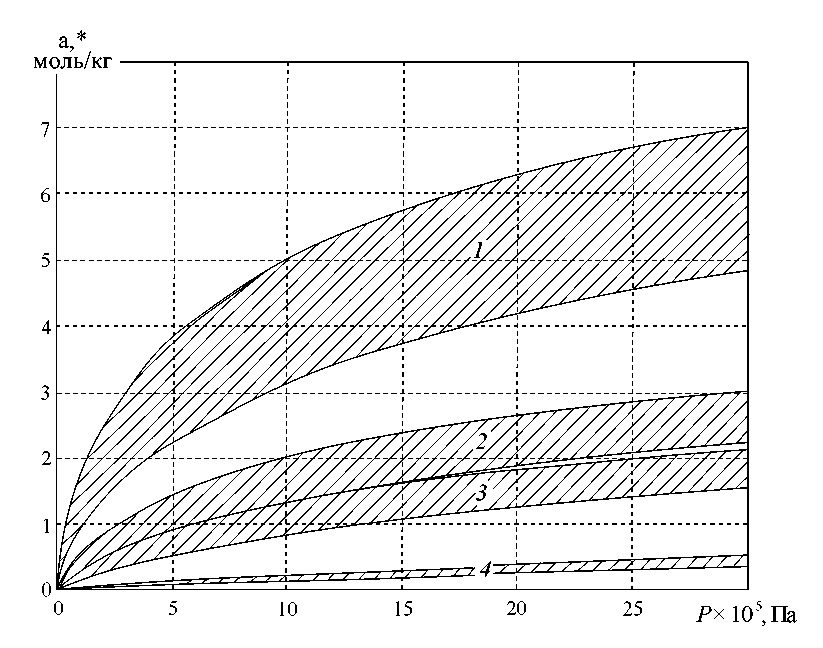 Для обоснованного выбора адсорбентов, обеспечивающих эффективное поглощение нецелевых компонентов разделяемой газовой смеси, необходимы экспериментальные изотермы сорбции. Их наличие особенно важно при низких парциальных давлениях поглощаемых компонентов в газовой смеси и, соответственно, малой движущей силе процесса сорбции, когда форма изотермы на начальном участке определяет эффективность поглощения соответствующего компонента адсорбтива газовой смеси, подлежащей разделению. Необходимо получение надежных изотерм компонентов газовой смеси, которые позволяют рассчитывать сорбцию при циклически изменяющемся давлении на стадиях адсорбции и десорбции при реализации процесса адсорбционного разделения газовых смесей. При этом наиболее надежным способом получения экспериментальных изотерм компонентов адсорбтива является их получение в достаточно широких диапазонах изменения давлений и температур с последующим построением аппроксимирующей зависимости, позволяющей рассчитывать непрерывное поле значений равновесных концентраций ak* компонентов адсорбтива.