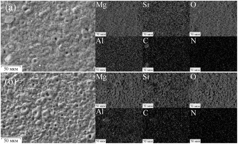 Химический состав и морфология покрытий. На рис. 1 представлены СЭМ-изображения и распределение элементов по поверхности образцов ПЭО-СДГ-BTA и ПЭО-CДГ(BTA), установленное с помощью ЭДС-картирования. Анализ полученных карт указывает на равномерное распределение Mg, Si, O, Al, C и N по поверхности покрытий. Mg, Si и O присутствуют в составе базового ПЭО-покрытия и остаются после обработки раствором при формировании пленки СДГ (рис. 1). Содержание данных элементов в защитном слое образца ПЭО-СДГ(BTA) составляет 18.8, 4.9 и 56.2% соответственно. Наличие 2–3 ат. % Al в покрытии является результатом формирования СДГ-слоя. Присутствие углерода в покрытии можно объяснить использованием ЭДТА-Na2 при синтезе СДГ. Содержание азота в ингибиторсодержащих покрытиях составляет около 1.5 ат. %, что позволяет предположить успешную импрегнацию покрытия ингибитором. Для образца ПЭО-СДГ-BTA были получены близкие результаты ЭДС анализа. Содержание Mg, Si, O и Al составило 17.1, 3.9, 56.5 и 1.6% соответственно.