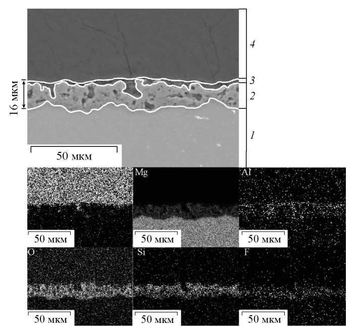 Рис. 2. СЭМ-изображение и карты распределения элементов по поперечному сечению покрытия образца ПЭО-СДГ. Области на СЭМ-изображении: сплав МА8 – 1, ПЭО-слой – 2, СДГ-слой – 3, эпоксидная смола – 4.
