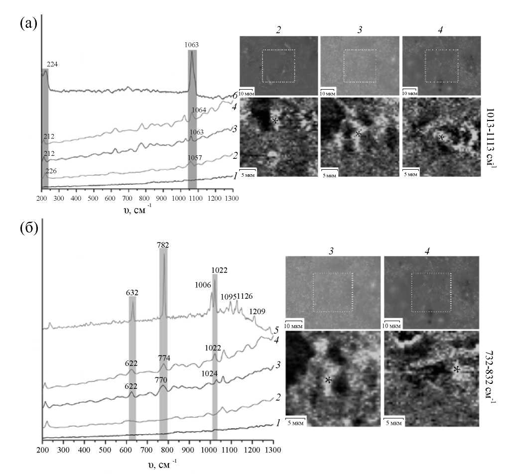 Рис. 4. Спектры комбинационного рассеяния, оптические изображения и карты распределения СДГ (а) и BTA (б) для исследуемых образцов. Спектры комбинационного рассеяния для образцов ПЭО-СДГ-BTA и ПЭО-СДГ(BTA) были записаны в точках, отмеченных на картах. Исследованы образцы: ПЭО – 1, ПЭО-СДГ – 2, ПЭО-СДГ-BTA – 3, ПЭО-СДГ(BTA) – 4, порошок BTA – 5, порошок СДГ –6.