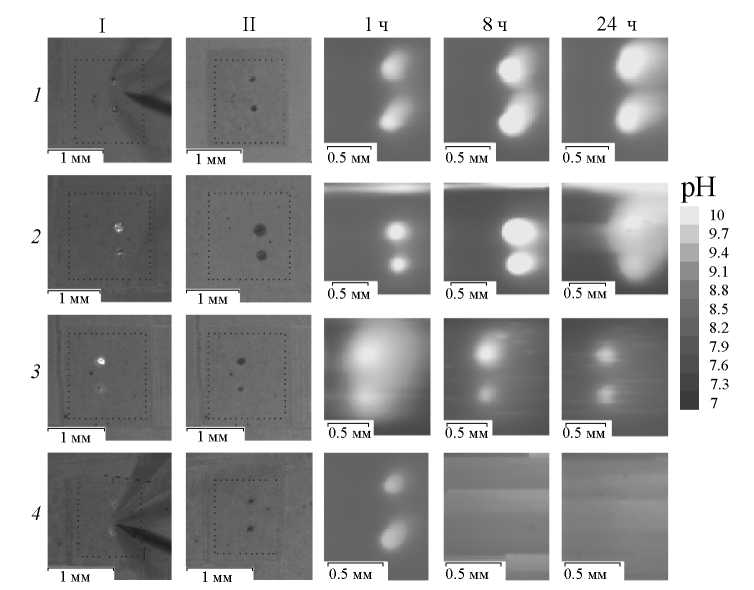 Рис. 6. Распределение локального рН (SIET-карты) на поверхности защитных покрытий с искусственно созданными дефектами, полученное при разном времени выдержки образцов в 0.05 М растворе NaCl, и оптические изображения сканированных участков (до выдержки – I, после 24 ч выдержки – II). Исследованы образцы: ПЭО – 1, ПЭО-СДГ – 2, ПЭО-СДГ(BTA) – 3, ПЭО-СДГ-BTA – 4.