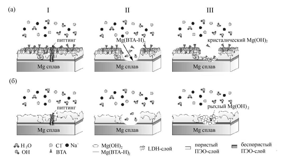 Рис. 8. Механизм коррозионной деградации магниевого сплава МА8 с ПЭО-СДГ(BTA)-покрытием (а) и базовым ПЭО-покрытием (б). I – в покрытии возникает дефект (а, б); II –инициация коррозионного процесса, приводящая к растворению магния (а, б); диффузия BTA в дефектную зону с образованием Mg(BTA-Н)2 (а); III – молекулы BTA и слой Mg(BTA-Н)2 ингибируют процесс коррозии, в результате чего образуется кристаллический Mg(OH)2 (а); рыхлые продукты Mg(OH)2 образуются в зоне дефекта базового ПЭО-покрытия (б).
