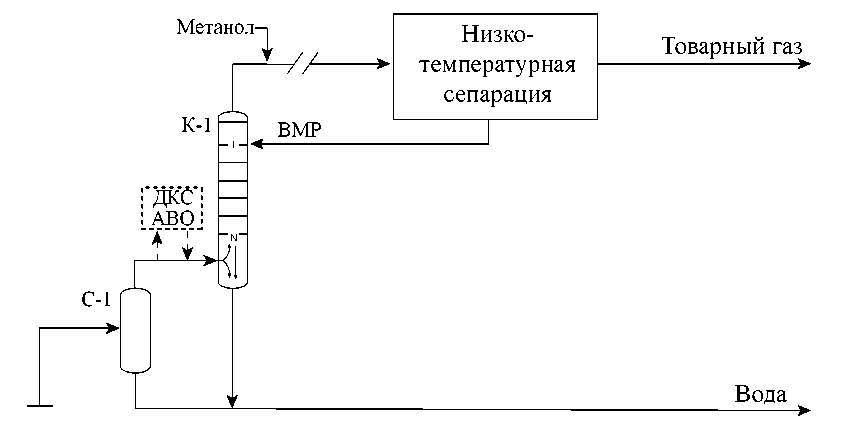 Рис. 1. Принципиальная технологическая схема низкотемпературной установки подготовки природного газа с десорбцией для смеси метан-метанол-вода: С-1 – сепаратор, К-1 – десорбционная колонна, ВМР – водно-метанольный раствор, АВО – аппарат воздушного охлаждения, ДКС – дожимная компрессорная станция.