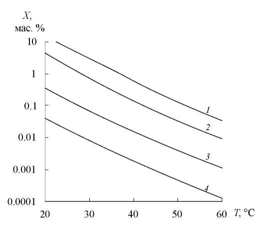 Рис. 2. Зависимость остаточной концентрации метанола в кубовой воде колонны десорбции К-1 (принципиальная технологическая схема приведена на рис. 1) от температуры процесса десорбции и величины удельного расхода орошения: 1 – 3 г/м3, 2 – 2 г/м3, 3 – 1 г/м3, 4 – 0,5 г/м3. Постоянные величины: давление в К-1 10 МПа, число теоретических тарелок 3, концентрация метанола в потоке орошения 60 мас. %.