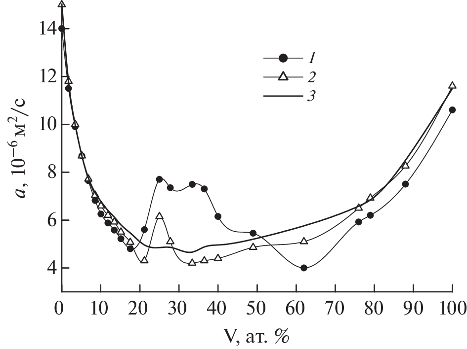 We report on the thermal diffusivities, specific heats, thermal conductivities, and electrical resistivities of 21 alloys of the nickel–vanadium system. It is found that heat transfer in NiV alloys is mainly executed by electrons. The behavior of temperature dependences of these properties shows that in the temperature range under investigation, the thermophysical characteristics of samples in the state of solid solutions and intermetallic compounds differ significantly because of the dependence of the energy structure of collectivized electrons on the system composition and temperature. It is shown that the concentration range in which the mutual solubility of component is ensured expands upon heating. The Nordheim rule for the alloys under investigation holds at temperatures close to the melting point and indicates the dependence of the density of states of collectivized electrons on the concentration of components.
