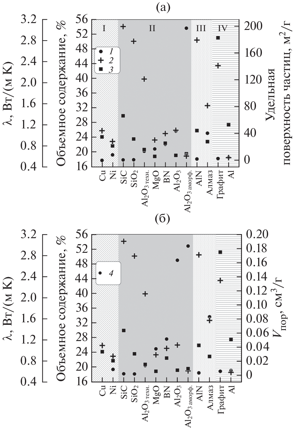 The dependences between thermal conductivity and the maximum volume fraction of the filler in heat sink compound on the size, morphology, specific surface area, and particle porosity, as well as the contact angle with silicone, of various materials such as aluminum oxides, silicon, magnesium, aluminum and boron nitrides, silicon carbide, metals (aluminum, copper, nickel), and carbon materials (graphite and diamond) is presented. The quality of the produced heat sink compound is not governed by any single property listed, but rather by the combination of properties such as morphology and specific surface area (or porosity) of the particles. For each type of filler particle shape, an inversely proportional relationship exists between the specific surface area and the maximum volume fraction of the polymer. Specific aspects were discussed regarding the effect of the material’s phase and chemical composition on the angle of wettability by polydimethylsiloxane.