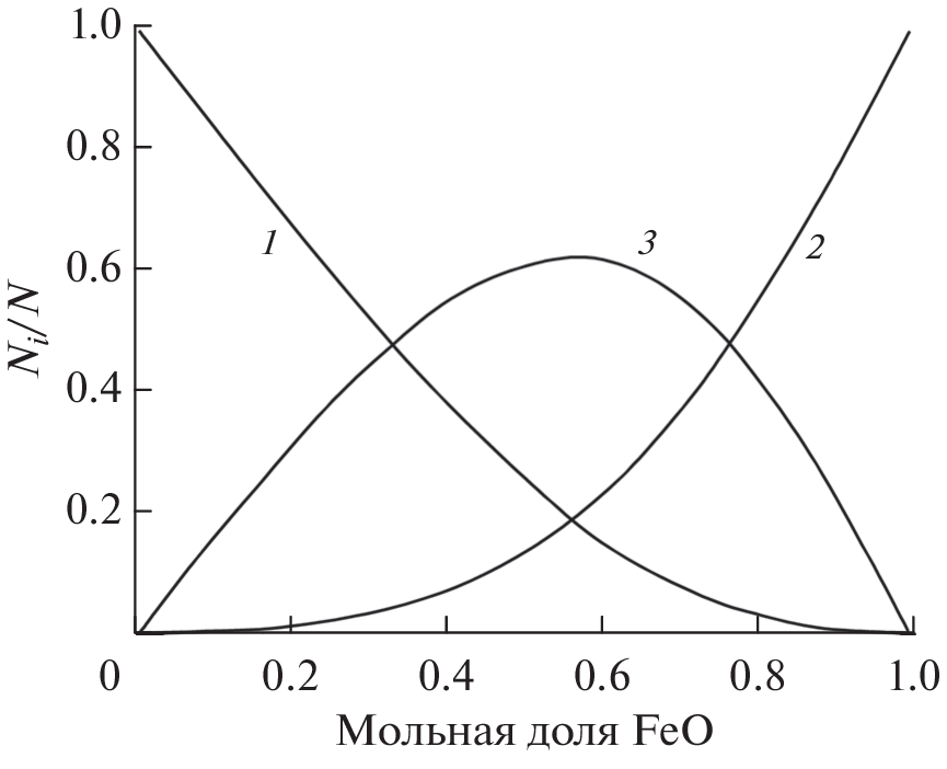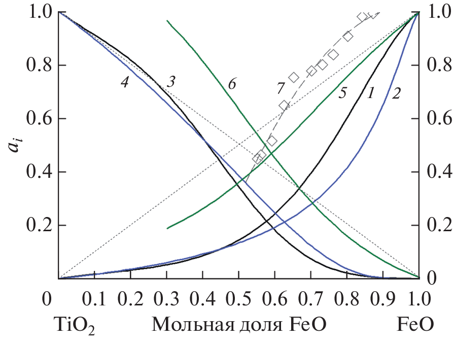 High-temperature differential mass spectrometry was used to study the vaporization processes and thermodynamic properties of samples of the Fe2O3–TiO2 system containing 25, 35, and 45 mol. % iron oxide. As shown earlier, at temperatures above 1400 K, Fe2O3, losing oxygen, turns into FeO. Therefore, in this article, a mass spectrometric thermodynamic study of the FeO–TiO2 system was carried out at a temperature of 1760 K. The composition and partial pressures of vapor, as well as the values of FeO activities and excess Gibbs energy in the FeO–TiO2 system were determined. Using the Wilson polynomial made it possible for the first time to estimate the mixing enthalpy and excess entropy in the FeO–TiO2 system at 1760 K. The thermodynamic properties of melts of the FeO–TiO2 system at 1760 K were modeled using the generalized lattice theory of associated solutions, and the relative numbers of bonds of various types in the model melt lattice were calculated, indicating the preferential formation of Fe–O–Ti bonds at a FeO content of 55 mol %. It is shown that at a temperature of 1760 K, the found values of the excess Gibbs energy in the FeO–TiO2 system are evidence of negative deviations from the ideality.