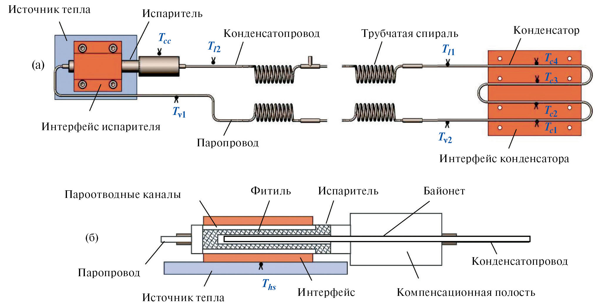 Дополнительные преимущества, которые позволяет реализовать данная схема, включают возможность достаточно легко конфигурировать паровую и жидкостную линии или делать их гибкими. Испаритель и конденсатор могут иметь различную форму и размеры, адаптированные к условиям практического применения этих устройств. Возможно также создание разветвленных устройств, включающих несколько испарителей и конденсаторов. Кроме того, при более благоприятном горизонтальном положении КТТ продемонстрировали способность передавать тепло на расстояние, измеряемое десятками метров. Такие устройства могут использоваться, например, в системах утилизации низкопотенциального тепла и солнечной энергии [5, 6], в системах обогрева помещений [7], в системах охлаждения мощной электроники [8, 9]. В [10] представлены результаты разработки и испытаний КТТ для эффективной утилизации энергии с длиной паровой линии 10 м и конденсатором длиной 3 м, которые имели диаметр 10 мм. В качестве теплоносителя использовался этанол. При горизонтальном расположении максимальная мощность устройства составила 160 Вт. Еще одна КТТ с такой же паровой линией и конденсатором длиной 8 м при горизонтальном расположении продемонстрировала максимальную мощность 340 Вт [11]. При работе в “антигравитационном” режиме, когда испаритель был расположен на 1 м выше конденсатора, максимальная мощность достигала 220 Вт. Весьма успешным является применение длинных КТТ в энергоэффективных системах терморегулирования космических аппаратов, где экономия энергии и массы имеет критическое значение [12–15]. В частности, была представлена информация о КТТ длиной 14 м с паровой линией диаметром 3 мм и пропиленом в качестве теплоносителя, которая была разработана для космической программы “Марс-96” [12]. Пропиленовые и аммиачные КТТ с длиной паровой линии 3 м и диаметром 3 мм также разрабатывались для системы терморегулирования космических аппаратов “Ямал-200” [13], один из которых успешно работает на орбите около 20 лет. Максимальная мощность 500 Вт была продемонстрирована здесь при наземных испытаниях КТТ с аммиаком в качестве теплоносителя. Среди аналогичных устройств с большой дистанцией передачи тепла следует отметить также КТТ с длиной паропровода 16 м и диаметром 4 мм, которая продемонстрировала максимальную мощность 100 Вт с аммиаком в качестве теплоносителя при благоприятной ориентации, когда испаритель был расположен ниже конденсатора на 0.68 м [16].