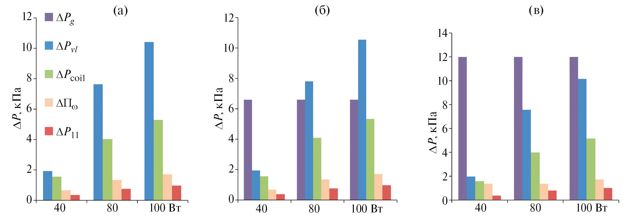 Результаты гидродинамического анализа КТТ для трех различных положений и тепловых нагрузок представлены в виде диаграмм. Видно, что при горизонтальном положении КТТ (рис. 5а) самые большие потери давления имеют место в паровой линии, которые увеличиваются с ростом тепловой нагрузки и достигают 78.8% при нагрузке 100 Вт. При Н = 1.1 м их доля снижается до 59.9% (рис. 5б). При самой неблагоприятной ориентации КТТ, когда испаритель находится выше конденсатора на 2 м, превалирующими становятся гидростатические потери давления, величина которых является постоянной, и их вклад при тепловой нагрузке 100 Вт составляет 48.8% (рис. 5в). Следует отметить также, что суммарные потери давления в трубчатых спиралях паровой линии также весьма существенны. При их отсутствии максимальная мощность КТТ может быть увеличена приблизительно до 150 Вт при горизонтальном расположении устройства. Гибкость устройства при этом практически сохраняется, но теряется возможность изменять его длину.