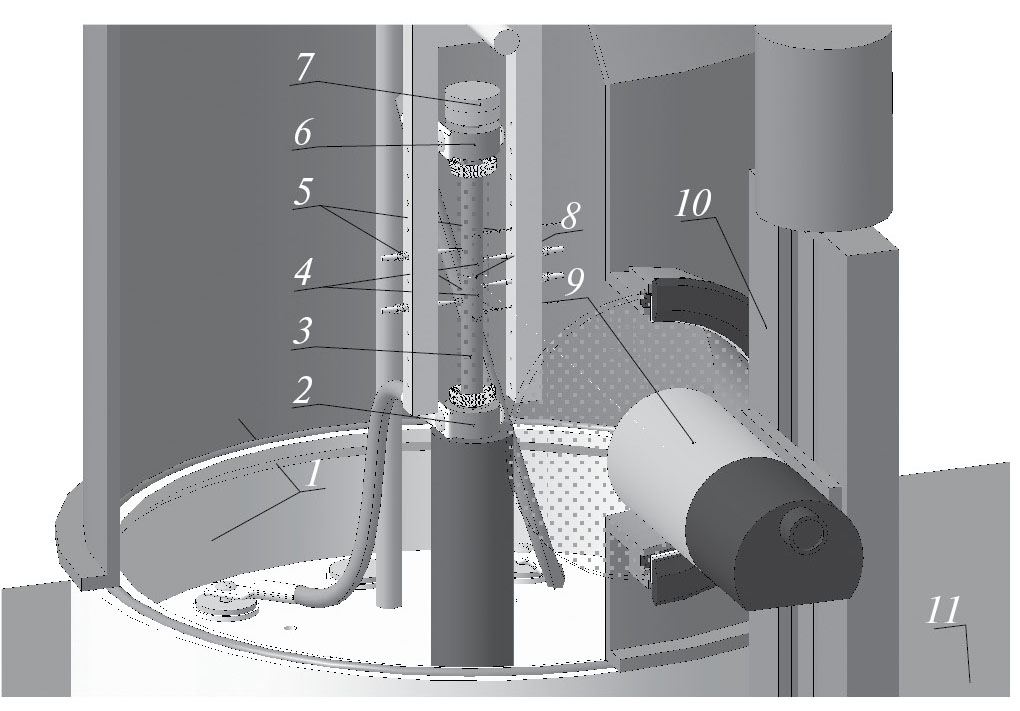 Рис. 1. Рабочий участок установки для измерения контактного электрического сопротивления: 1 – корпус вакуумной камеры, 2 – нижний токоподвод, 3 – кварцевая трубка, 4 – образцы, 5 – термопары, 6 – верхний токоподвод, 7 – грузики, 8 – контактная поверхность, 9 – ИК-пирометр, 10 – линейный модуль перемещения пирометра вдоль вертикальной оси образца, 11 – вакуумный пост ВУП-5.