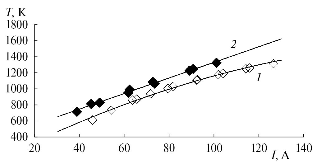 Рис. 3. Зависимости температуры Т от силы тока I: 1 – измеренная в центре изотермического участка образца, в котором отсутствует контактная плоскость; 2 – температура Tмакс, измеренная в плоскости контакта (P = 105 кПа, положительный электрод внизу).