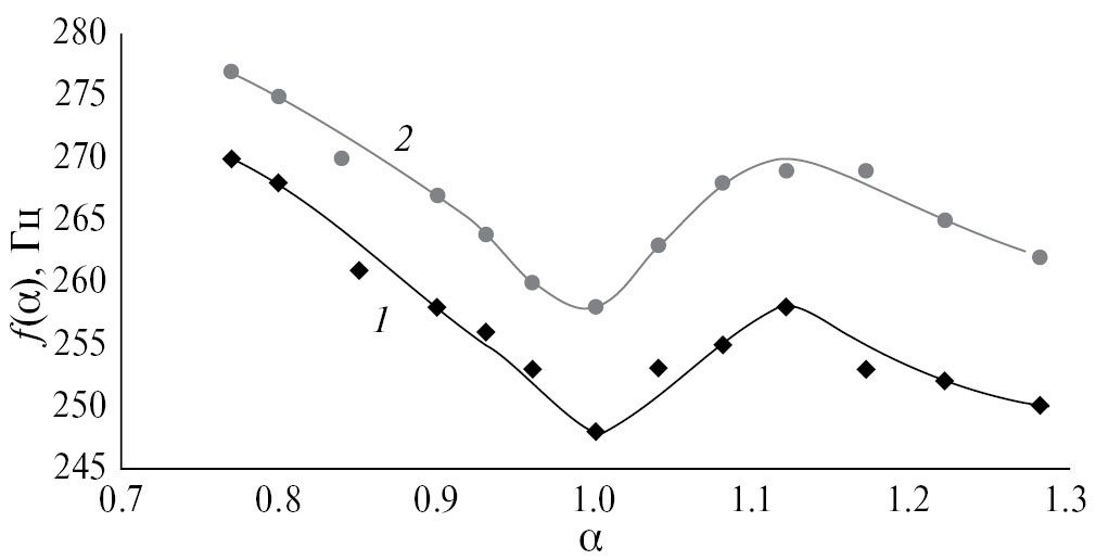 Рис. 6. Зависимости частоты колебаний газа от коэффициента избытка воздуха при lс = 0.45 м, lt = 0.48 м: 1 – n = 4, 2 – 2.