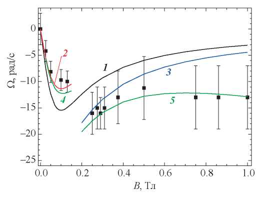 Рис. 3. Зависимость угловой скорости вращения пылевой структуры внутри вставки от магнитного поля при p = 0.4 Торр, I = 1.5 мА; маркеры – экспериментальные данные; 1–3 – учет только ионного увлечения, [25]; 4, 5 – учет также увлечения нейтральным газом (данная работа); 2, 4 – l = 0.2 см; 3, 5 – 1 см.