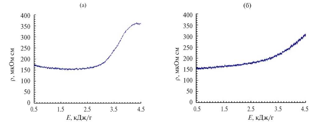 Рис. 5. Зависимости удельного электросопротивления жидкого гафния от введенной удельной энергии Е при нагреве в воде (а), при нагреве в стекле (б) (повышенное давление): начало жидкого состояния – E ≈ 0.6 кДж/г.