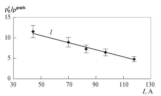 Рис. 2. Зависимость удельного КЭС при Р = 100 кПа, измеренного в ПК и отнесенного к удельному электрическому сопротивлению графита для аналогичного образца в отсутствие ПК, от силы тока при источнике питания, находящемся около верхнего торца образца.
