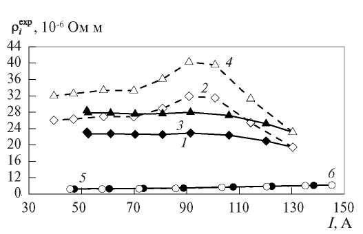 Рис. 3. Зависимости экспериментального удельного электрического сопротивления ρiexp, измеренного при Р = 100 кПа на различных расстояниях от ПК, от силы тока в режиме нагрева (1, 3, 5) и охлаждения (2, 4, 6): 1, 2 – Li/2 = 9.8 мм; 3, 4 – 3.2; 5, 6 – образец, в котором отсутствует ПК.
