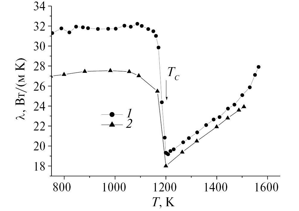 Рис. 4. Теплопроводность сплава Ni2V (Ni–33 ат. % V) неотожженного образца: 1 – общая теплопроводность, 2 – электронная компонента теплопроводности.
