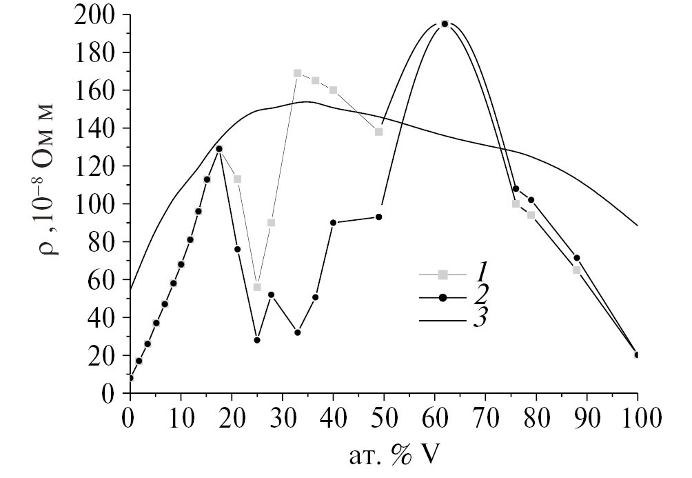 Рис. 5. Концентрационные зависимости удельного электросопротивления сплавов системы NiV: 1 – неотожженные образцы, 300 K; 2 – отожженные образцы, 300 K; 3 – 1500 K.