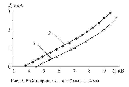 Рис. 9. ВАХ шарика: 1 – h = 7 мм, 2 – 4 мм.