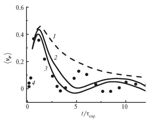 Рис. 3. Зависимость нормированной радиальной скорости ионов, усредненной по угловым координатам от времени при r / σ0 = 1.25 и различных значений β: 1 – β = 0, 2 – 6.7, 3 – 38.0, 4 – эксперимент [14].