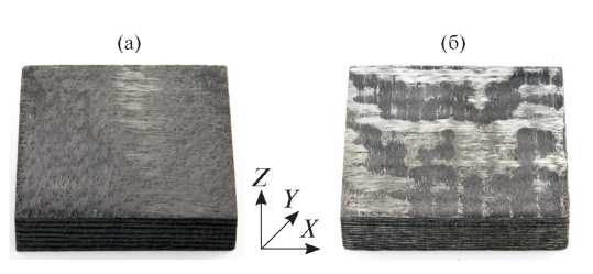Внешний вид исследуемых материалов приведен на рис. 1. Видно, что они имеют слоистую структуру с толщиной слоя ~0.7 мм, состоящего из углеродной матрицы и армирующего волокна. Плоскость армирования X–Y расположена вдоль слоев углеродной ткани, ось Z направлена перпендикулярно им. Таким образом, у данных материалов имеются два характерных направления и, соответственно, два основных компонента тензора кинетических свойств: в направлении плоскостей слоев и перпендикулярно этим плоскостям. При этом сами значения свойств являются эффективными, так как характеризуют свойства данного объема слоистого материала в том или ином направлении.
