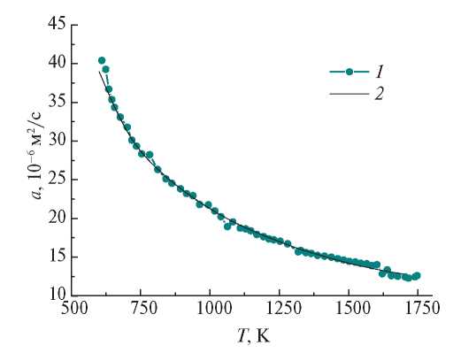 Для калибровки установки были произведены измерения температуропроводности графита марки POCO AXМ-5Q. Результаты измерений представлены на рис. 2. Каждая точка на графике отражает значения, осредненные по 100 периодам колебаний температуры. В исследованном интервале температур 600–1750 К полученная температурная зависимость температуропроводности графита (кривая 1) хорошо согласуется с табличными данными [16] (кривая 2). Максимальное отклонение экспериментальных точек от калибровочной кривой (до 7%) наблюдается в начале температурного диапазона, соответствующего пороговой чувствительности используемого фотоприемника. В остальной части диапазона отклонение не превышает 4%.