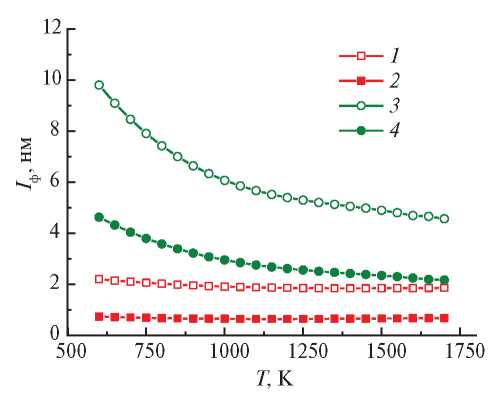 Рис. 5. Температурные зависимости коэффициента средней длины свободного пробега фононов в образцах № 1 (1 – вдоль X–Y,2 – вдоль Z) и № 2 (3 – вдоль X–Y, 4 – Z).