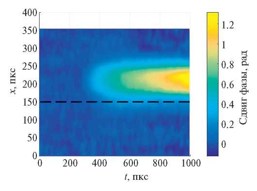 Рис. 1. Пространственно-временное распределение изменения фазы зондирующего импульса ∆ϕ(x, t) при выходе ударной волны на свободную тыльную поверхность образца; калибровочный коэффициент для оси времени – 0.164 пс/пкс, для пространственной оси – 0.3 мкм/пкс.
