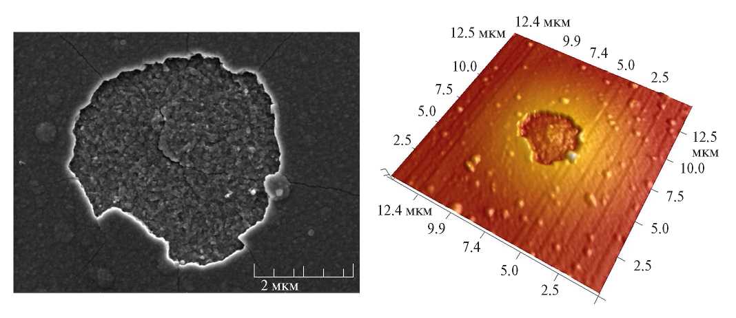 В геометрии острой фокусировки нагревающего излучения на тыльной стороне пленки был получен откольный кратер. На рис. 3 представлены СЭМ- и АСМ-изображения свободной поверхности пленочного образца ванадия вблизи порога разрушения после воздействия ФЛИ с плотностью энергии в центре пятна F0 = 0.76 Дж/ см2. На рис. 4 показан профиль сечения кратера, полученного с помощью АСМ (рис. 3б), построенного по центру области взаимодействия.