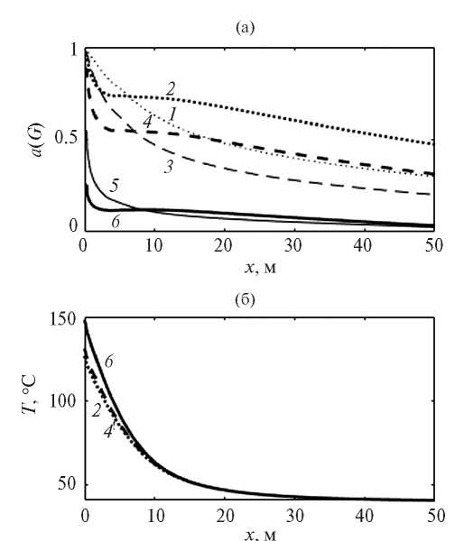 Рис. 2. Распределения коэффициента нелинейной фильтрации (а), температуры в пласте (б) при km = 10 ×10–15 м2, ∆t2 = 100 сут, δo= 1.0 × 10–4 1/К, ∆P = 10 МПа, Ng = 0 кВт (1, 3, 5) и Ng = 100 (2, 4, 6): 1, 2 – Gi = 0.05 МПа/м; 3, 4 –0.1; 5, 6 – 1.