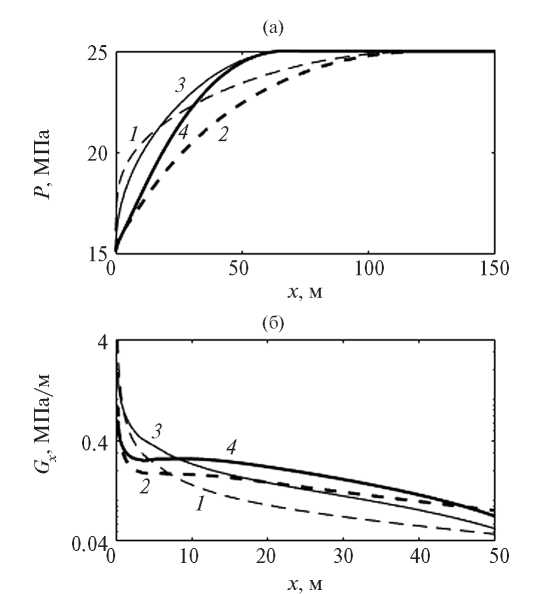 Рис. 3. Распределения давления (а), градиента давления в пласте (б) при km = 10 ×10–15 м2, ∆t2 = 100 сут, δo= 1.0 × 10–4 1/К, ∆P = 10 МПа, Ng = 0 кВт (1, 3) и Ng = 100 (2, 4): 1, 2 – Gi = 0.1 МПа/м; 3, 4 – 1.