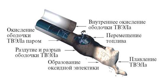На рис. 1 [11] представлено плавление ТВЭЛа с сопутствующими ему процессами в случае аварий с потерей теплоносителя (АПТ, loss-of-coolant accident – LOCA).