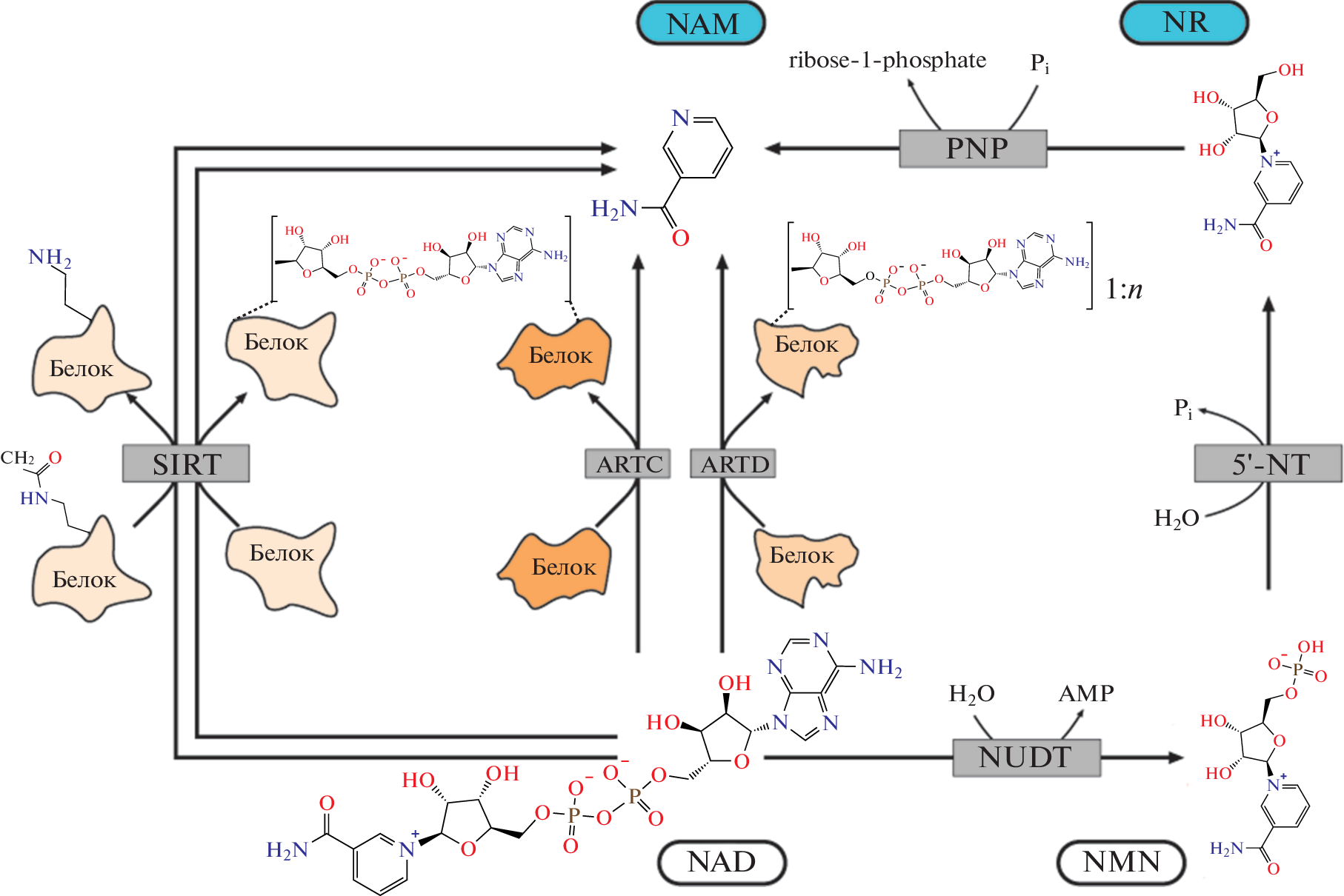 - Yang Y., Sauve A.A. 2016. NAD(+) metabolism: bioenergetics, signaling and manipulation for therapy. Biochim. Biophys. Acta. V. 1864. P. 1787.