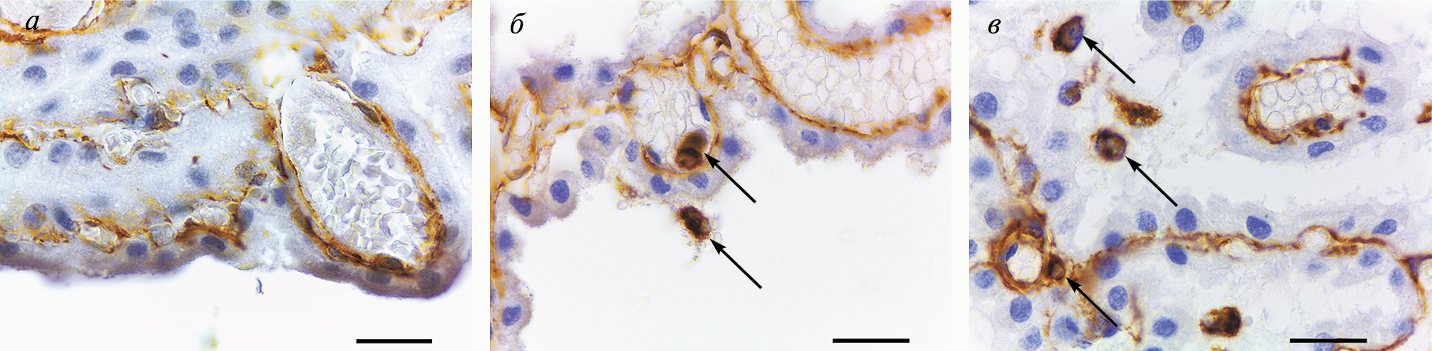Рис. 1. Фрагменты сосудистого сплетения боковых желудочков головного мозга крыс линии Wistar (a), Wistar-Kyoto (б), SHR (в). Иммуноцитохимическая реакция на белок Iba-1 с подкраской ядер гематоксилином. Объектив Plan-Apochromat 10×/0.22. Стрелки указывают на клетки Колмера. Масштабный отрезок равен 20 мкм