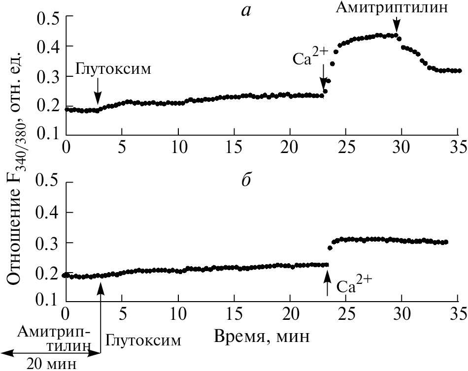 Использованы реактивы производства фирмы Sigma-Aldrich (США). Маточные растворы Fura-2AM (1 мМ), ЦПК (10 мМ) и тапсигаргина (0.5 мМ) готовили в диметилсульфоксиде. Препараты глутоксим и моликсан предоставлены фирмой “ФАРМА-ВАМ” (Санкт-Петербург). Маточные растворы глутоксима (50 мг/мл), амитриптилина (20 мг/мл) и моликсана (50 мг/мл) готовили в воде.
