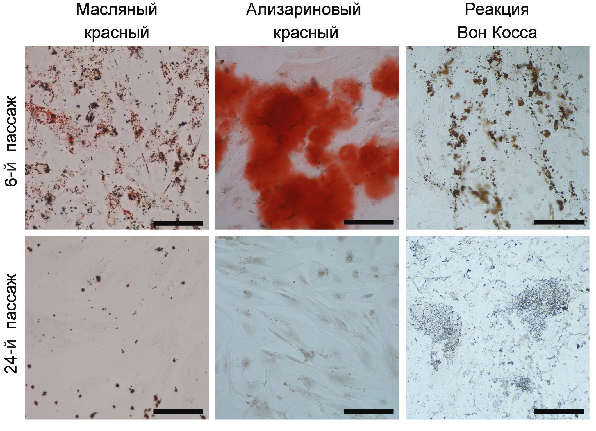 Рис. 5. Визуализация дифференцировки клеток линии MSCWJ-3 в адипогенном и остеогенном направлении на пассажах 6 и 24. Жировые включения (адипогенная дифференцировка) окрашены масляным красным (масштабная линейка: 100 мкм), соли кальция в межклеточном пространстве выявлены окраской ализариновым красным и реакцией Вон Косса (масштабная линейка: 200 мкм).