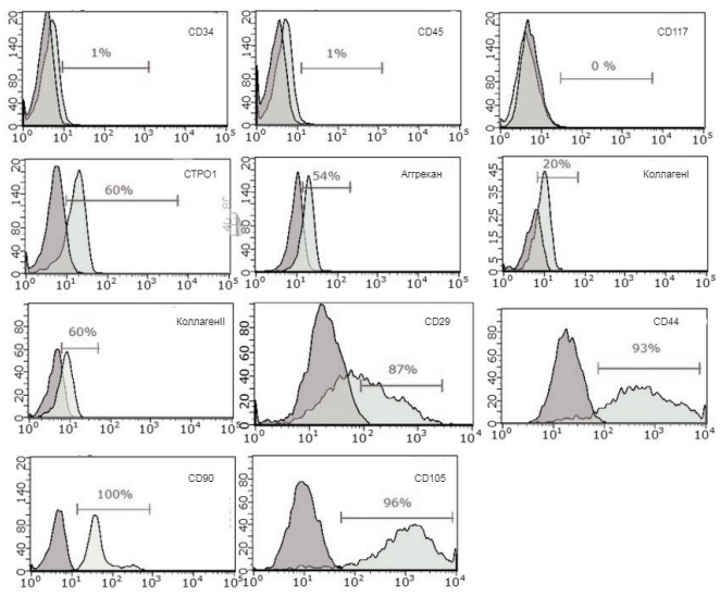 Анализ данных проточной цитометрии показал, что клетки, полученные из хрящевой ткани крысы, экспрессировали маркеры МСК CD29 (87%), CD44 (93%), CD90 (100%), CD105 (96%), STRO-1 (60%), а также специфический маркер аггрекан (54%), коллаген I (20%) и коллаген II (60%) (рис. 1). Таким образом, полученные клетки являются хондроцитами.