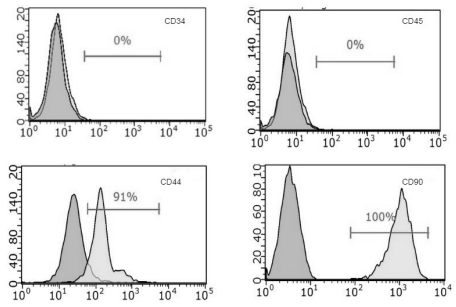 Рис. 2. Гистограммы проточной цитометрии клеток, выделенных из жировой ткани лошади с использованием специфических флуоресцентно-меченных антител, демонстрирующие количество клеток, несущих антигены CD34, CD45, CD44, CD90.