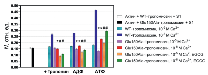 Измерения проводили при низкой (10–8 М) и высокой (10–5 М) концентрации ионов Са2 в отсутствии нуклеотидов (+ Тропонин) и в присутствии АДФ и АТФ. Изменения значений N между мышечными волокнами, содержащими тропомиозин дикого типа (WT-тропомиозин) и тропомиозин с заменой Glu150Ala (Glu150Ala-тропомиозин) (*), а также между мышечными волокнами, содержащими тропомиозин с заменой Glu150Ala в отсутствие и в присутствии EGCG (#) достоверны при P < 0.05.