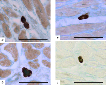 При использовании протоколов № 1–3 наблюдали интенсивную неспецифическую реакцию в цитоплазме кардиомиоцитов (рис. 1а—в), гладкомышечных клеток сосудов и эндотелиоцитов. Проведение термического демаскирования антигена при использовании вторичных антител из набора VECTASTAIN существенно не влияло на результат: разность интенсивности тучных клеток и фона не менялась, однако начинали неспецифически выявляться гранулы липофусцина в цитоплазме кардиомиоцитов. Стоит отметить, что во всех случаях и при использовании любых реагентов, проведение термического демаскирования антигена приводило к разной степени яркости окрашивания гранул липофусцина. Примечательно, что интенсивность окраски липофусцина при использовании мышиных моноклональных антител эквивалентна интенсивности окраски гранул тучных клеток, что затрудняет идентификацию последних при малом увеличении объектива микроскопа. Стоит также отметить, что материал, фиксированный в цинк-этанол-формалине, показал наиболее интенсивную окраску липофусцина в сравнении с материалом, фиксированном в формалине, что свидетельствует о влиянии способа фиксации на специфичность связывания антител.