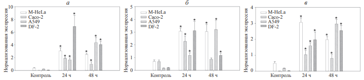 Клетки карциномы шейки матки человека M-HeLa, карциномы легкого человека A549, аденокарциномы ободочной кишки человека Caco-2 и дермальные фибробласты человека DF-2 получены из «Коллекции культур клеток позвоночных» (Институт цитологии РАН, Санкт-Петербург). M-HeLa выращивали на среде Игла MEM с 1% набором заменимых аминокислот, A549 и Caco-2 – на среде DMEM, DF-2 на среде DMEM/F12 (“Биолот”, Россия). Все среды содержали 10% эмбриональной бычьей сыворотки (Sigma, США). Клетки культивировали на 12-луночном планшете при 37 °С в атмосфере 5% СО2 до образования 70–80% монослоя.