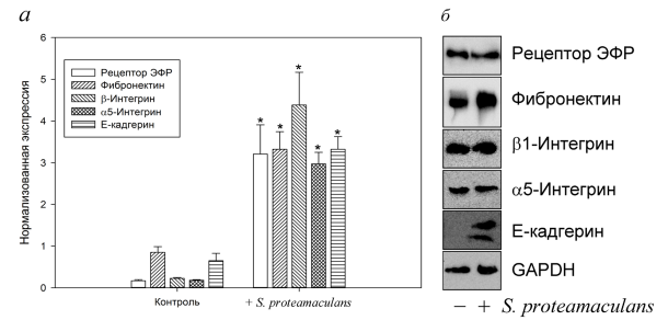 Рис. 4. Экспрессия (а, ОТ-ПЦР) и содержание (б, Вестерн-блотинг) ряда белков (рецептора ЭФР, фибронектина, β1- и α5-субъединиц интегрина, Е-кадгерина) в клетках А549 при их контакте с бактериями S. proteamaculans. Бактерии на стадии роста 48 ч добавляли к клеткам эукариот на 2 ч. Контроль – незараженные клетки. β-Актин (ОТ-ПЦР) и GAPDH (Вестерн-блотинг) использовали в качестве внутреннего контроля. Разницу экспрессии относительно незараженных клеток считали достоверной при *P < 0.05.