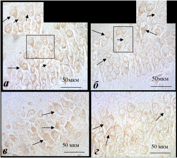 а – диффузное распределение иммуноположительных нейронов в СА1 (длинная стрелка), иммуноотрицательные нейроны (короткая стрелка, увел. фрагмент); б – сокращение числа иммуноположительных нейронов (длинная стрелка) в СА1 после воздействия гипоксии, иммуноотрицательные нейроны (короткая стрелка, увел. фрагмент); в – иммуноположительные нейроны (длинная стрелка) в поле СА3 в контроле; г – сокращение числа иммуноположительных нейронов (длинная стрелка) в СА3 после воздействия гипоксии, нейроны имеют меньший объем цитоплазмы по сравнению с контролем.
